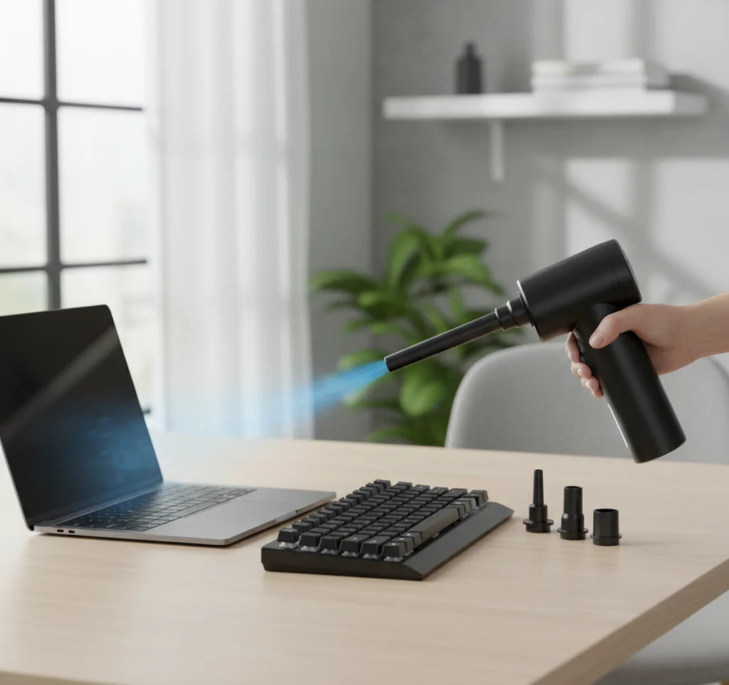 Oubliez les bombes à air jetables. notre Duster Air est rechargeable, compact et toujours prêt. un nettoyage simple et moderne.